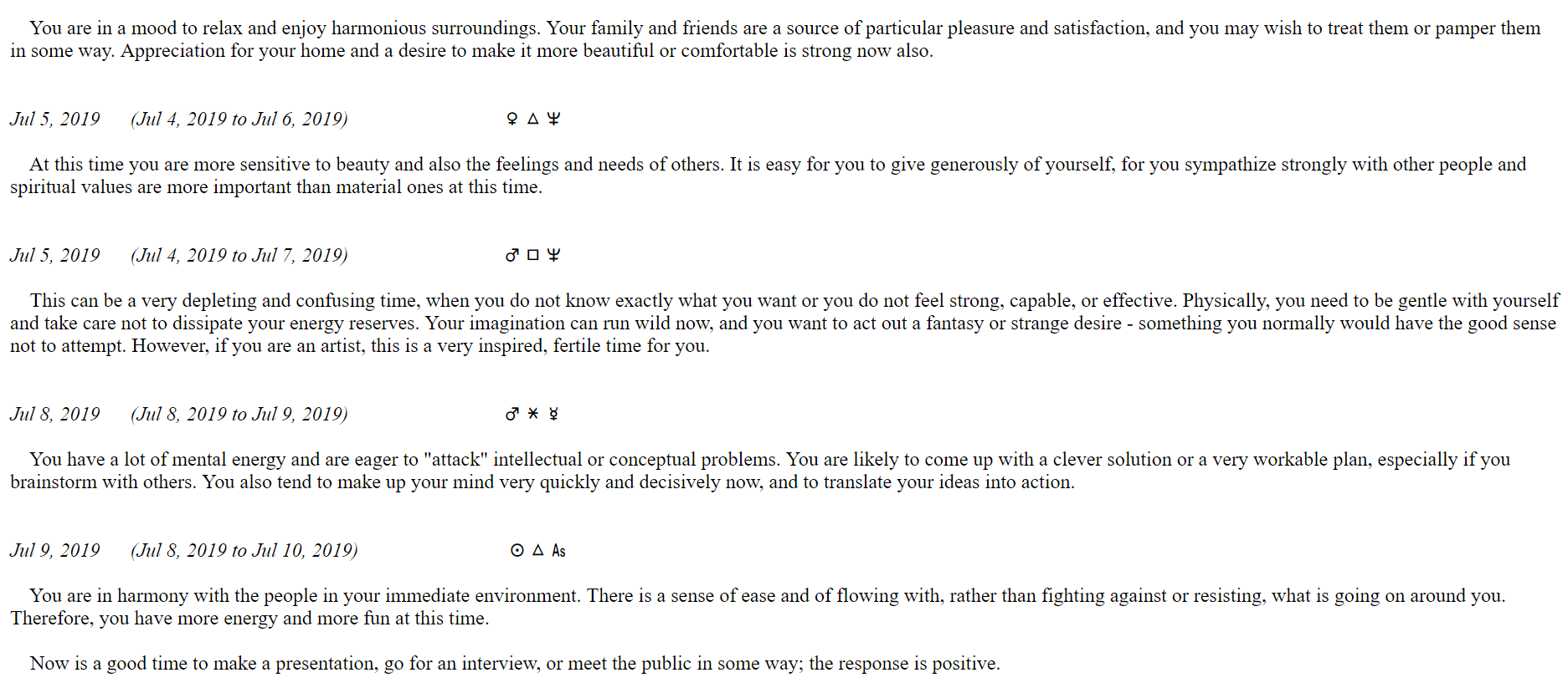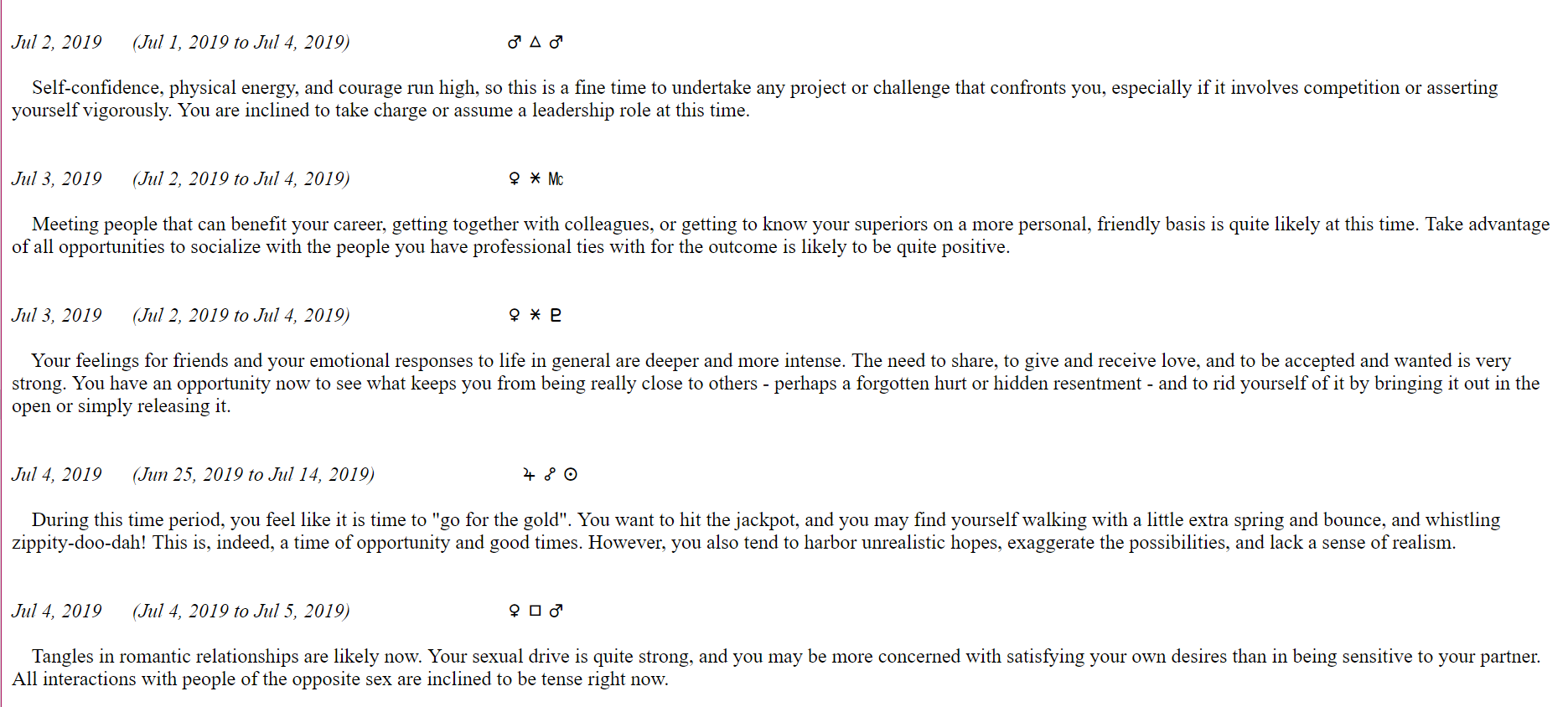 Learn Astrology and be ahead of the game by keeping track of your personal transits! Some transits last for months while others can only be a day or 2. This Personal Transit Forecast will list in order by date transits to your natal Sun, Moon, Mercury, Venus, Mars, Jupiter, Saturn, Uranus, Neptune, and Pluto, as well as the ever-so-important Ascendant (AC) and Midheaven (MC).